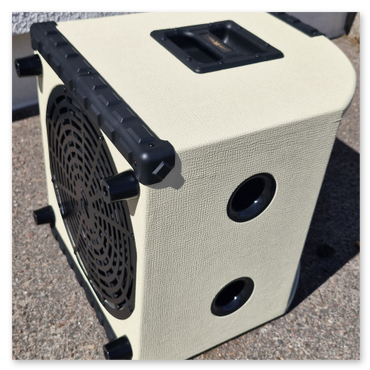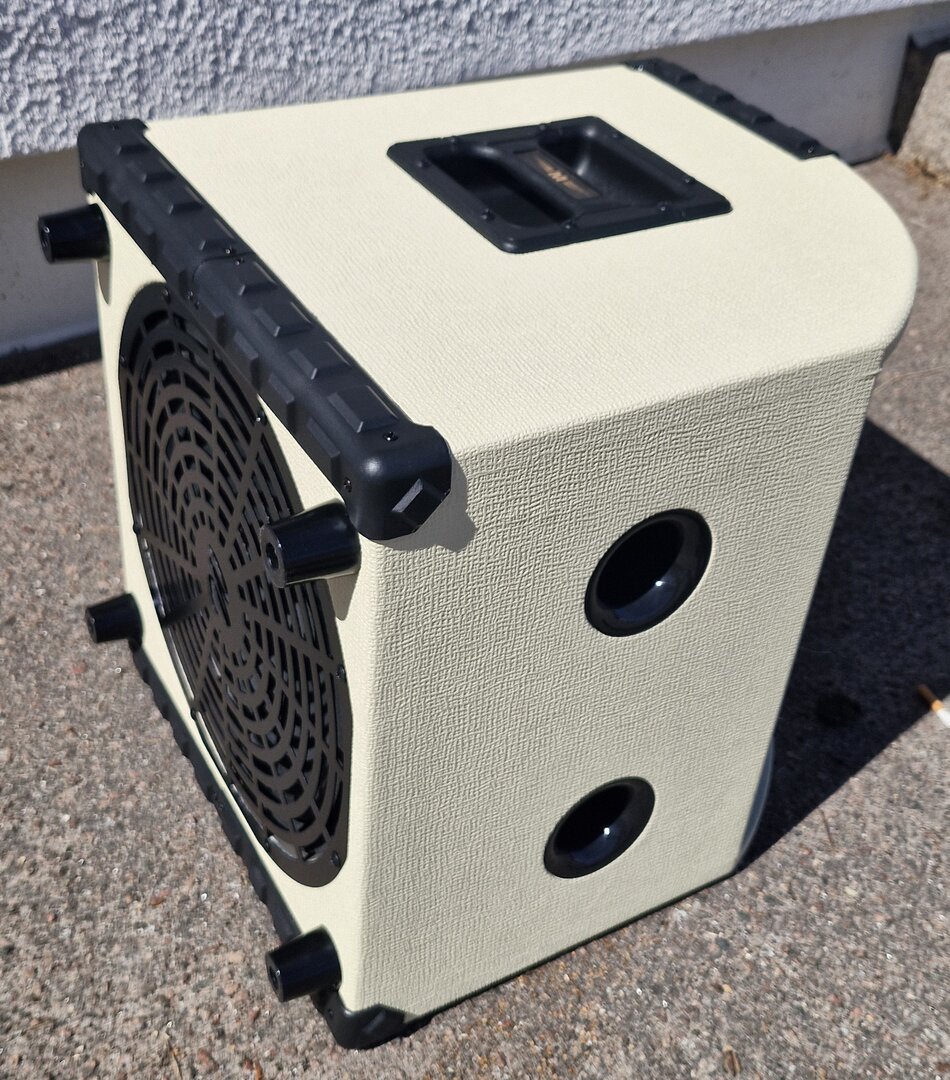 Finessen är att högtalarna är riktade snett uppåt så man kan ställa förstärkaren på golvet och låta ljudet från de simulerade piporna studsa tillbaka från rummets akustik.