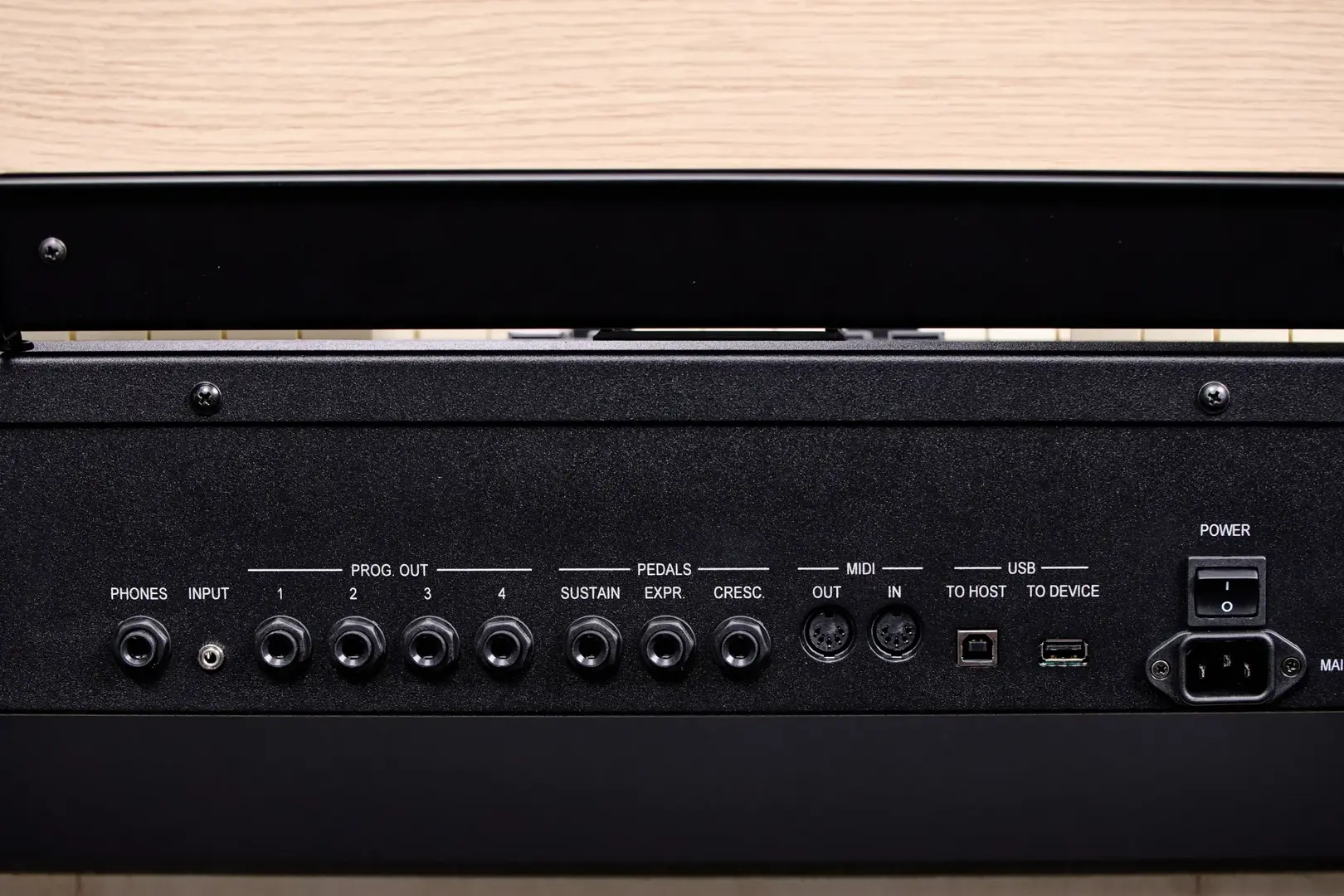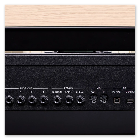 Inbyggt högtalarsystem, hörlursutgång och MIDI-anslutning för t ex att ansluta en pedal, samt ingång för sustainpedal och svällare.