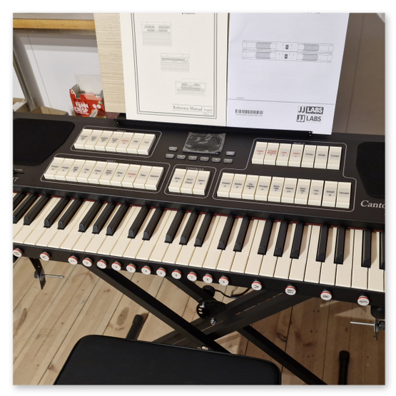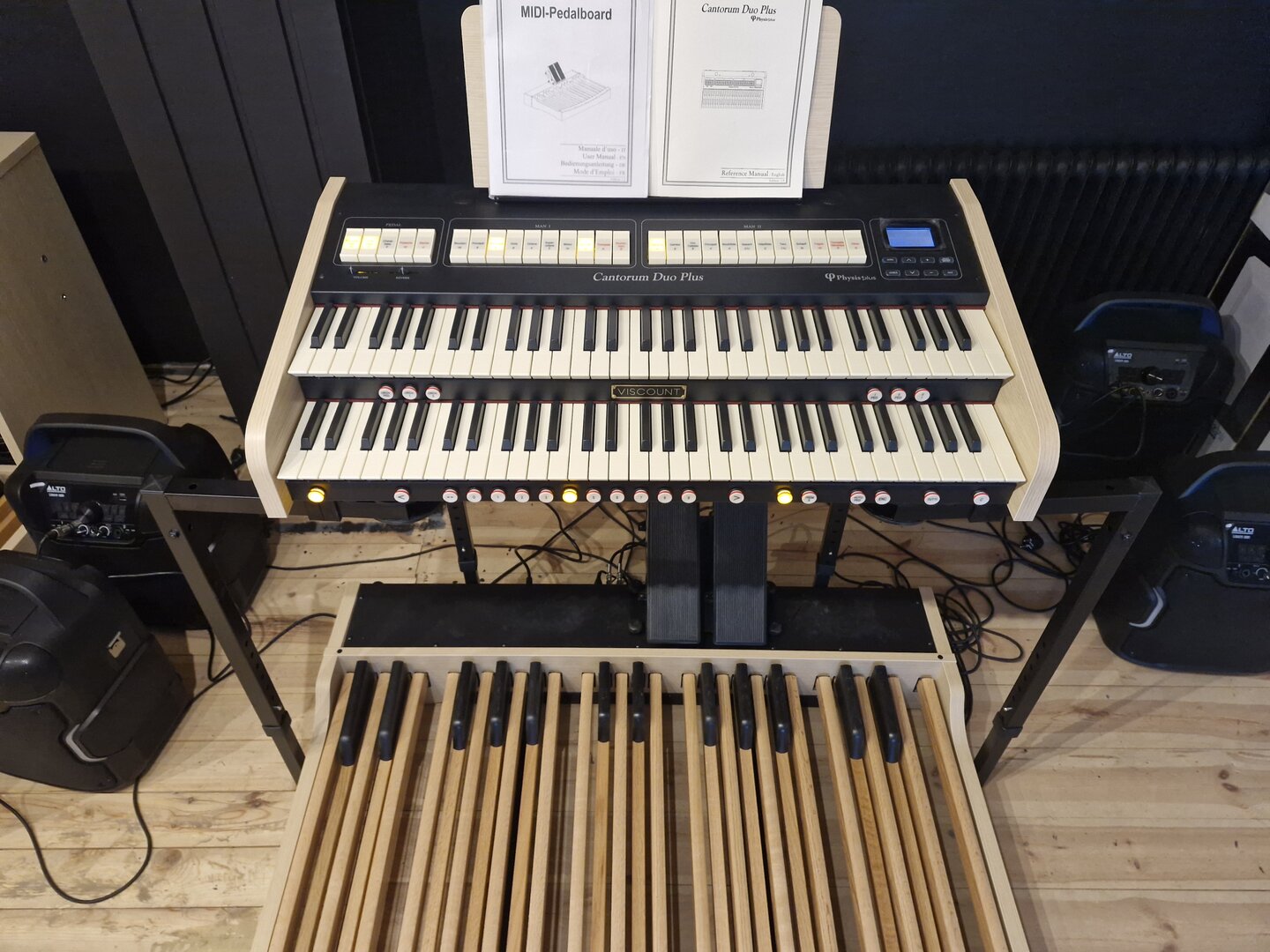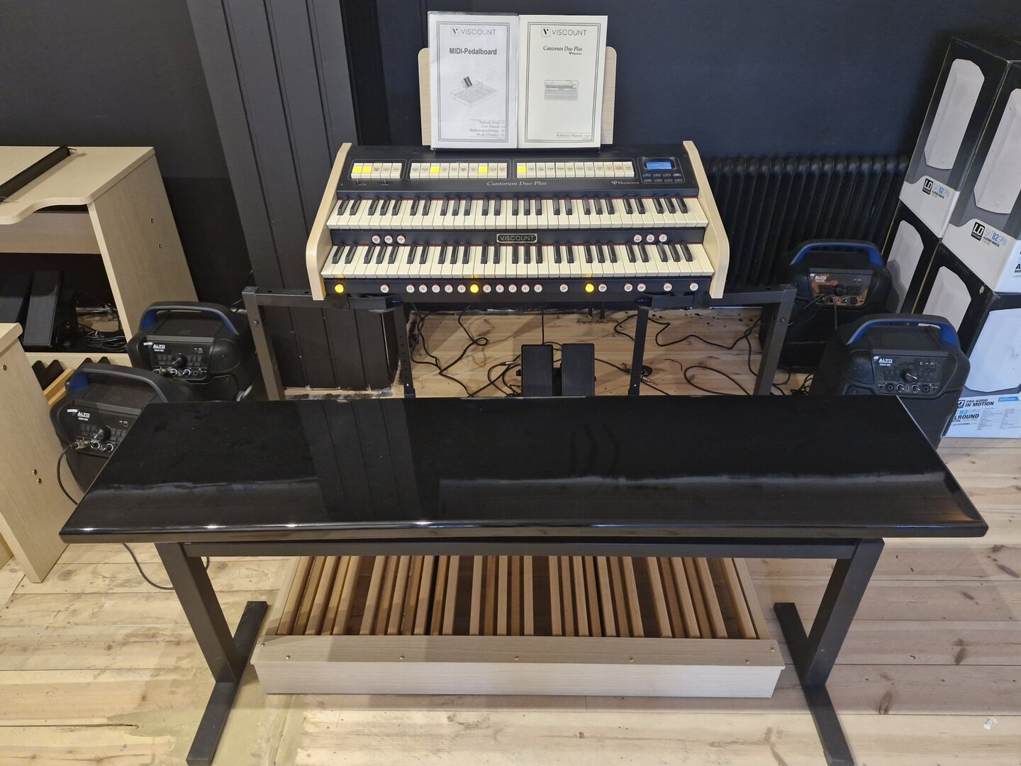 Det är ett paket med Cantorum DUO med XL stativ + 30 tasters pedal + svällare + en Antoni hydraulisk bänk med ställbar höjd.