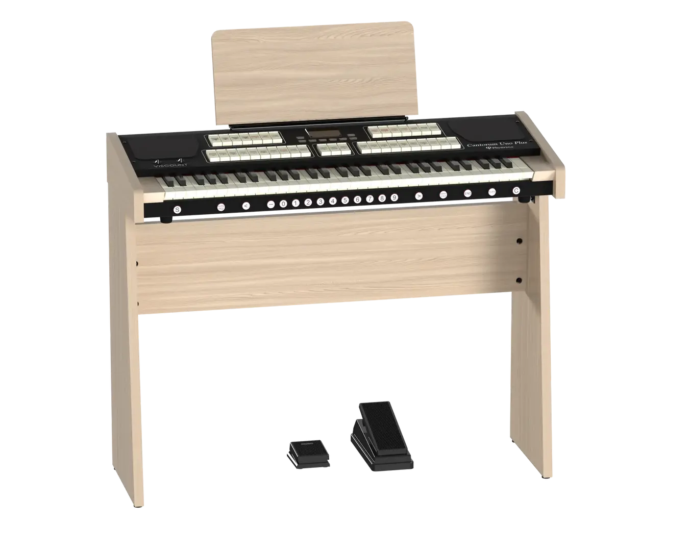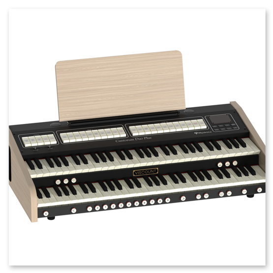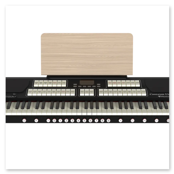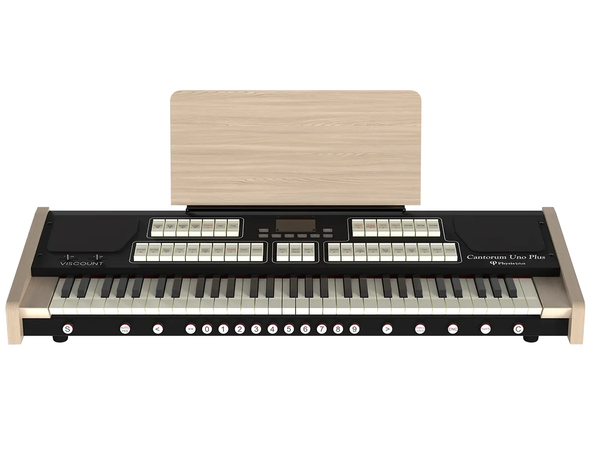 Det nya notstället i trä ingår och man kan även köpa till fabrikens specialstativ i ekfinish med volym- och sustainpedal. Ljudet genereras av Viscount senaste Physis Plus-teknik och förstärks av de två dubbelkoniga 5' bredbandshögtalare så att det kan användas även utan externa högtalare. Viscount Cantorum Unico Plus finns både med standardklaviaturen och man kan även uppgradera till TP8LW mörk träklädd klaviatur.