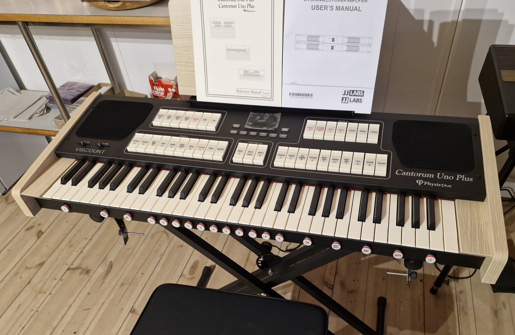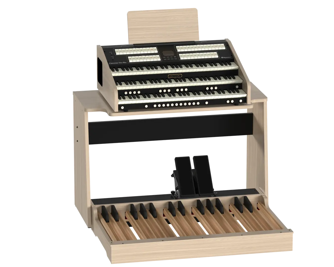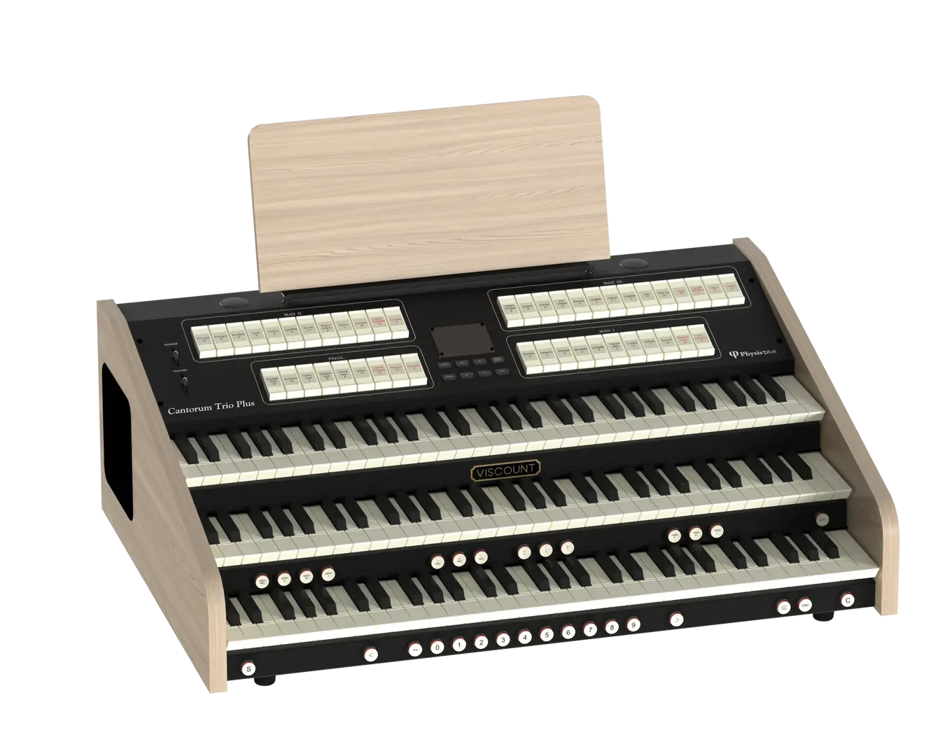 Det nya notstället i trä ingår och man kan även köpa till fabrikens specialstativ i ekfinish med volym- och sustainpedal. Ljudet genereras av Viscount senaste Physis Plus-teknik och förstärks av de två dubbelkoniga 5' bredbandshögtalare så att det kan användas även utan externa högtalare. Viscount Cantorum Unico Plus finns både med standardklaviaturen och man kan även uppgradera till TP8LW mörk träklädd klaviatur.