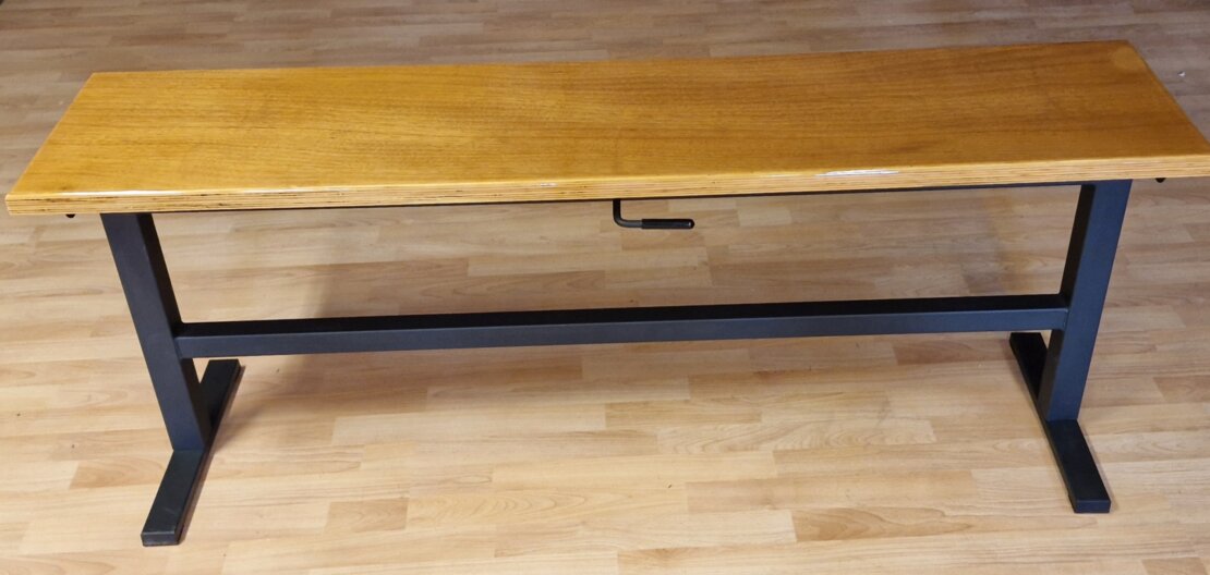 Fotstödets underdel sitter 20 cm upp från golvet så att konkava pedaler får plats. Sitsen är av trä med rundada kanter, storlek 150X34,5 cm med tålig brun lack.